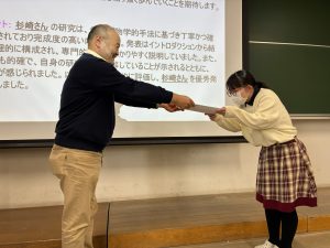 卒論、修論発表会、杉崎さん 優秀発表賞受賞 2026年3月3日 本年度の卒業研究発表会(学部4年生 土肥さん、山田さん)と修士論文発表会(杉崎さん、橘さん)が行われました。みなさんお疲れ様でした。 杉崎さんが修士論文発表会で優秀発表賞を受賞しました。おめでとうございます!